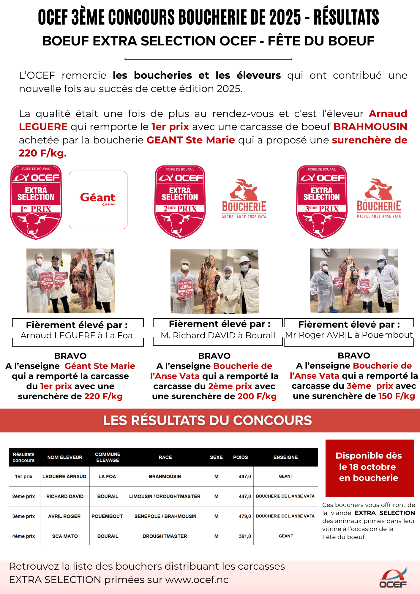 L’OCEF remercie chaleureusement les bouchers et les éleveurs qui ont contribué au succès de cette3ème édition du Concours Boucherie Extra Sélection, organisée dans le cadre de la Fête du boeuf.